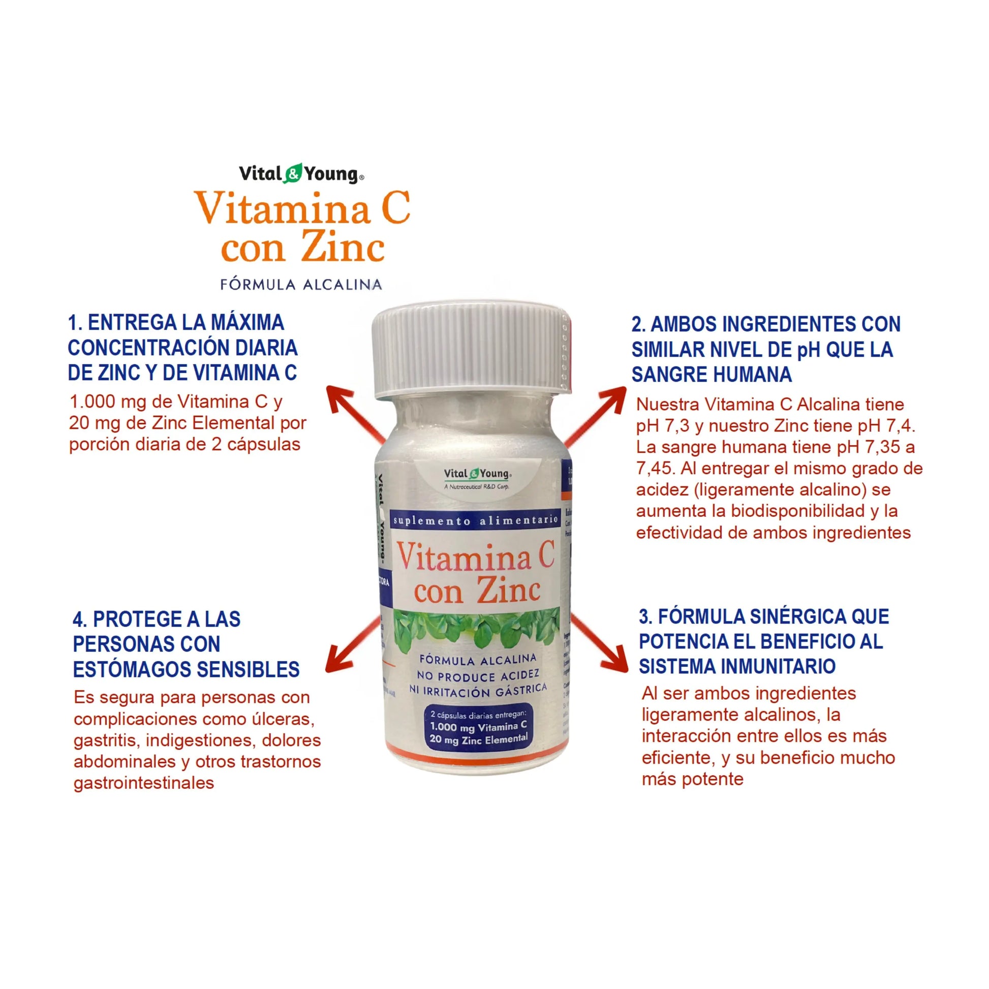 - Principios activos: Vitamina C alcalina (ascorbato de calcio) y zinc elemental (ZnO).